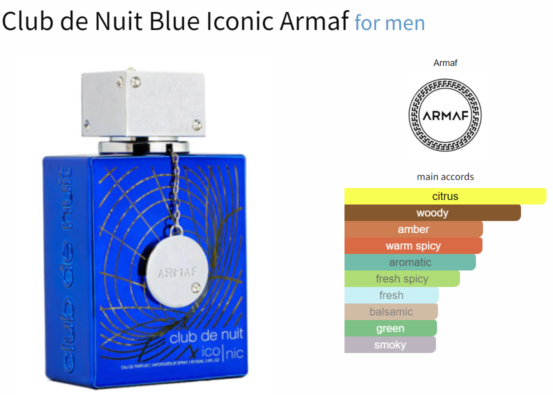 Club de Nuit Blue Iconic by Armaf is a fragrance for men. This is a new fragrance. Club de Nuit Blue Iconic was launched in 2022. Top notes are Grapefruit, Lemon, Mint, Pink Pepper and Coriander; middle notes are Ginger, Melon, Nutmeg and Jasmine; base notes are Woody Notes, Incense, Sandalwood, Amber, Cedar, Patchouli and Labdanum.