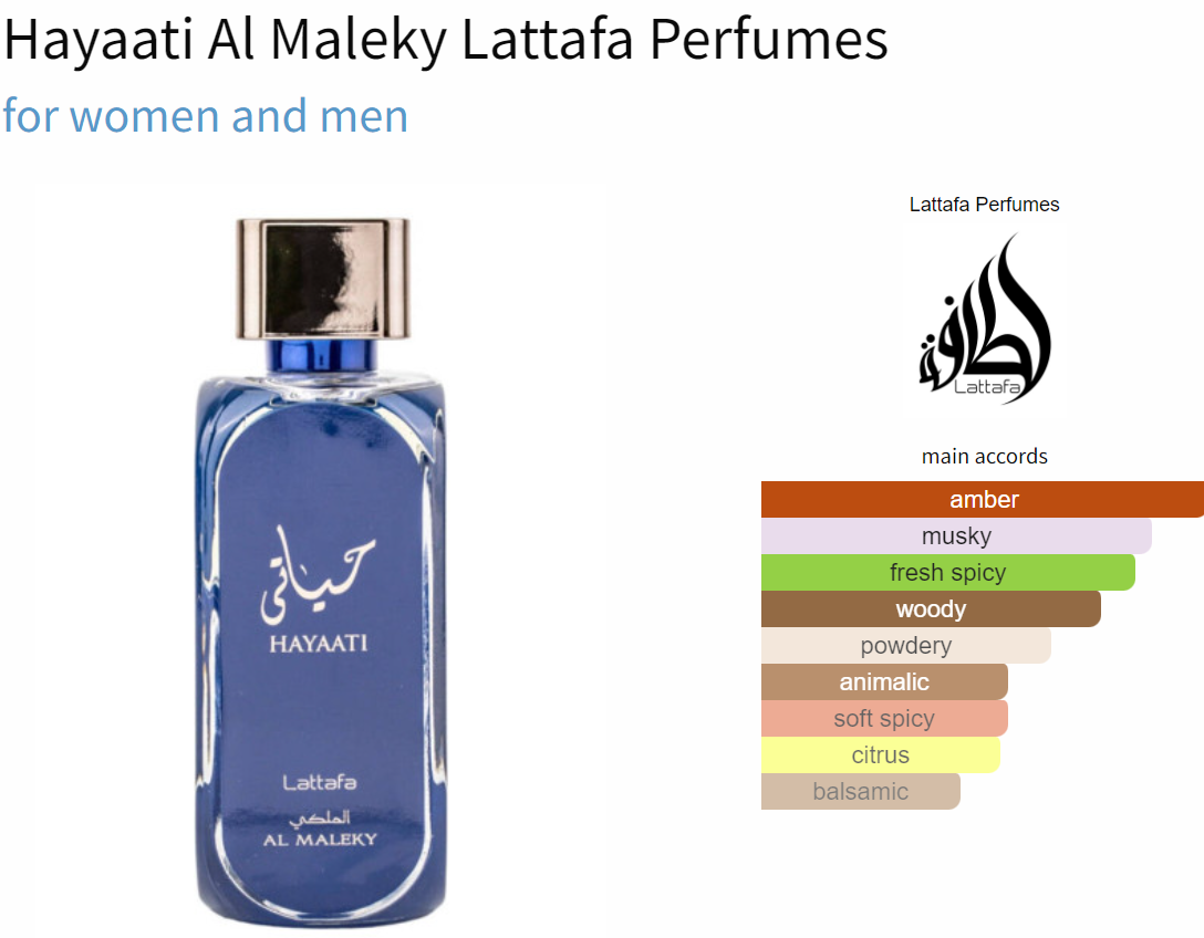 Hayaati Al Maleky by Lattafa Perfumes is a Oriental Spicy fragrance for women and men. This is a new fragrance. Hayaati Al Maleky was launched in 2022. Top notes are Pink Pepper, Nutmeg, Bergamot and Ginger; middle notes are Cedar, Woody Notes, Incense and Labdanum; base notes are Musk, Amber and Ambergris.