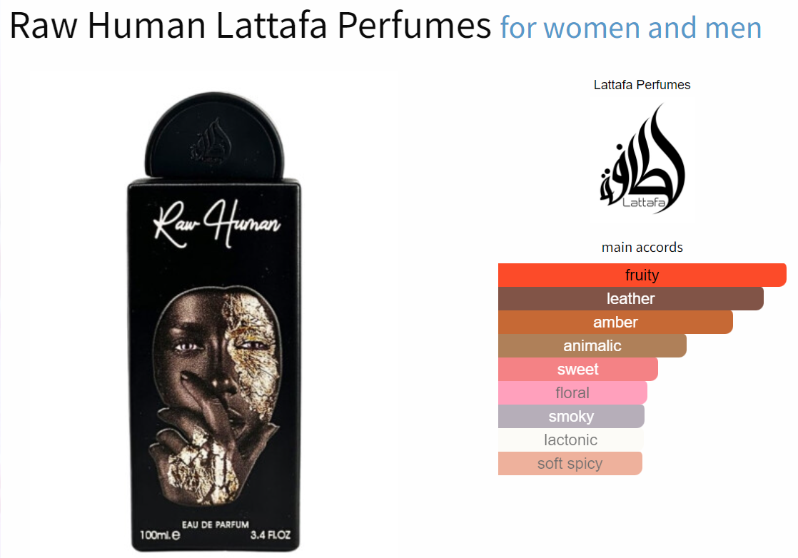 Raw Human by Lattafa Perfumes is a Oriental fragrance for women and men. This is a new fragrance. Raw Human was launched in 2024. Top notes are Apricot, Plum and Pink Pepper; middle note is Osmanthus; base notes are Leather, Styrax and Olibanum.