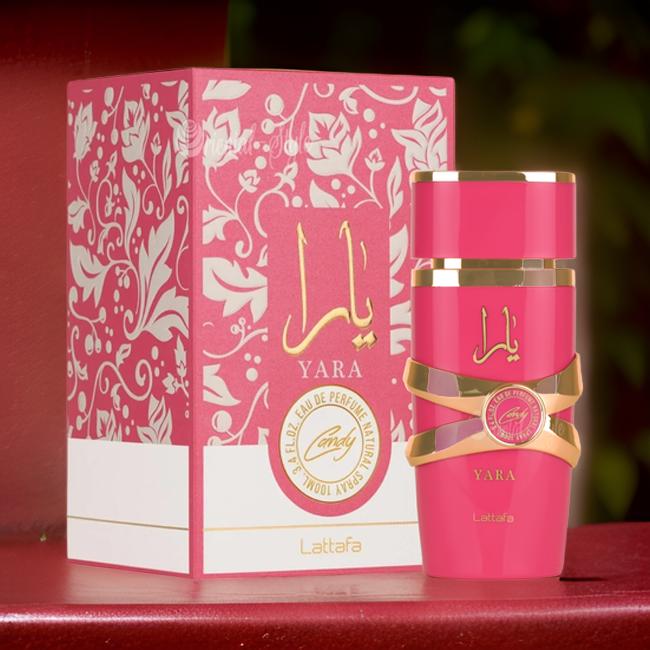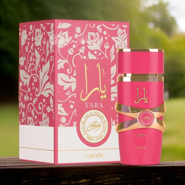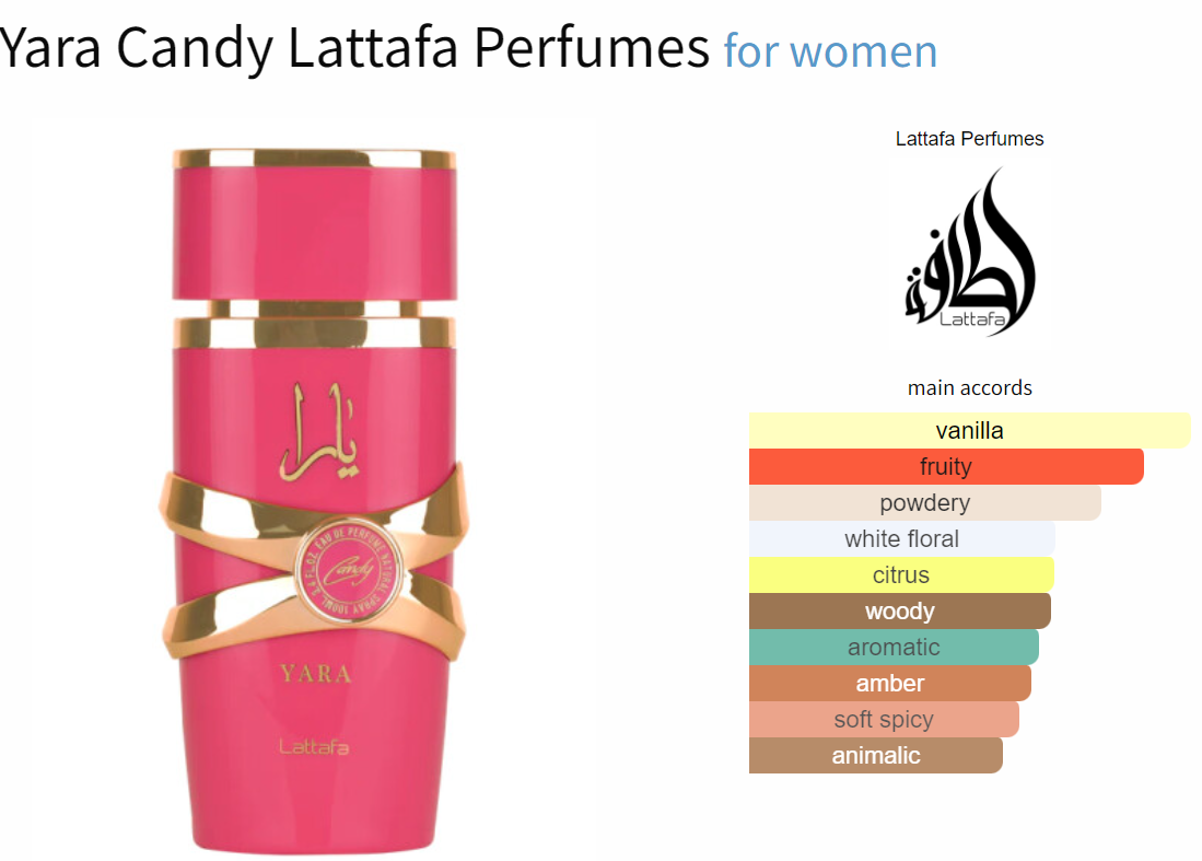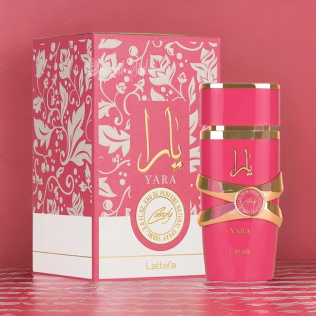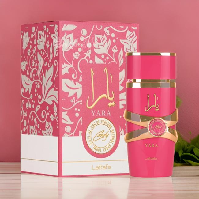 Yara Candy by Lattafa Perfumes is a Floral Fruity Gourmand fragrance for women. This is a new fragrance. Yara Candy was launched in 2024. Top notes are Black Currant and Green Tangerine; middle notes are Strawberry Fizz Candy and Gardenia; base notes are Vanilla, Amber, Musk and Sandalwood.