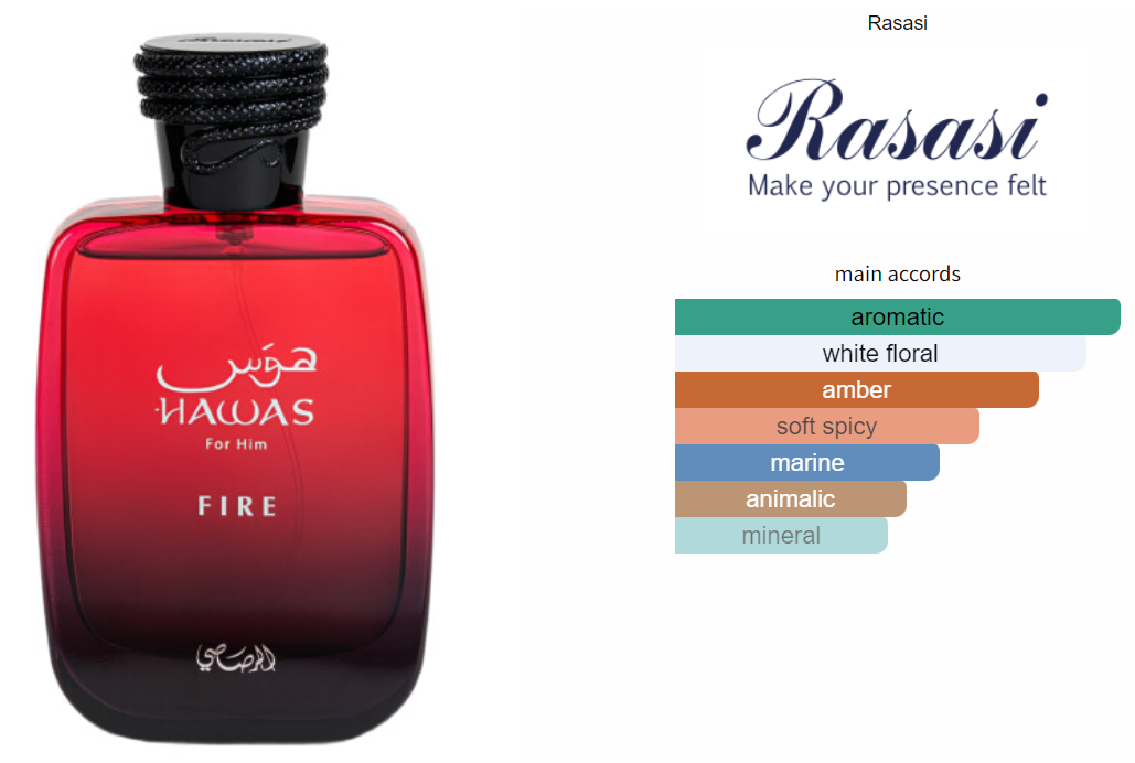 Hawas Fire by Rasasi is a Aromatic Aquatic fragrance for women and men. This is a new fragrance. Hawas Fire was launched in 2025. Top note is Clary Sage;